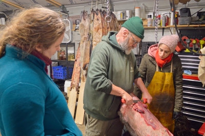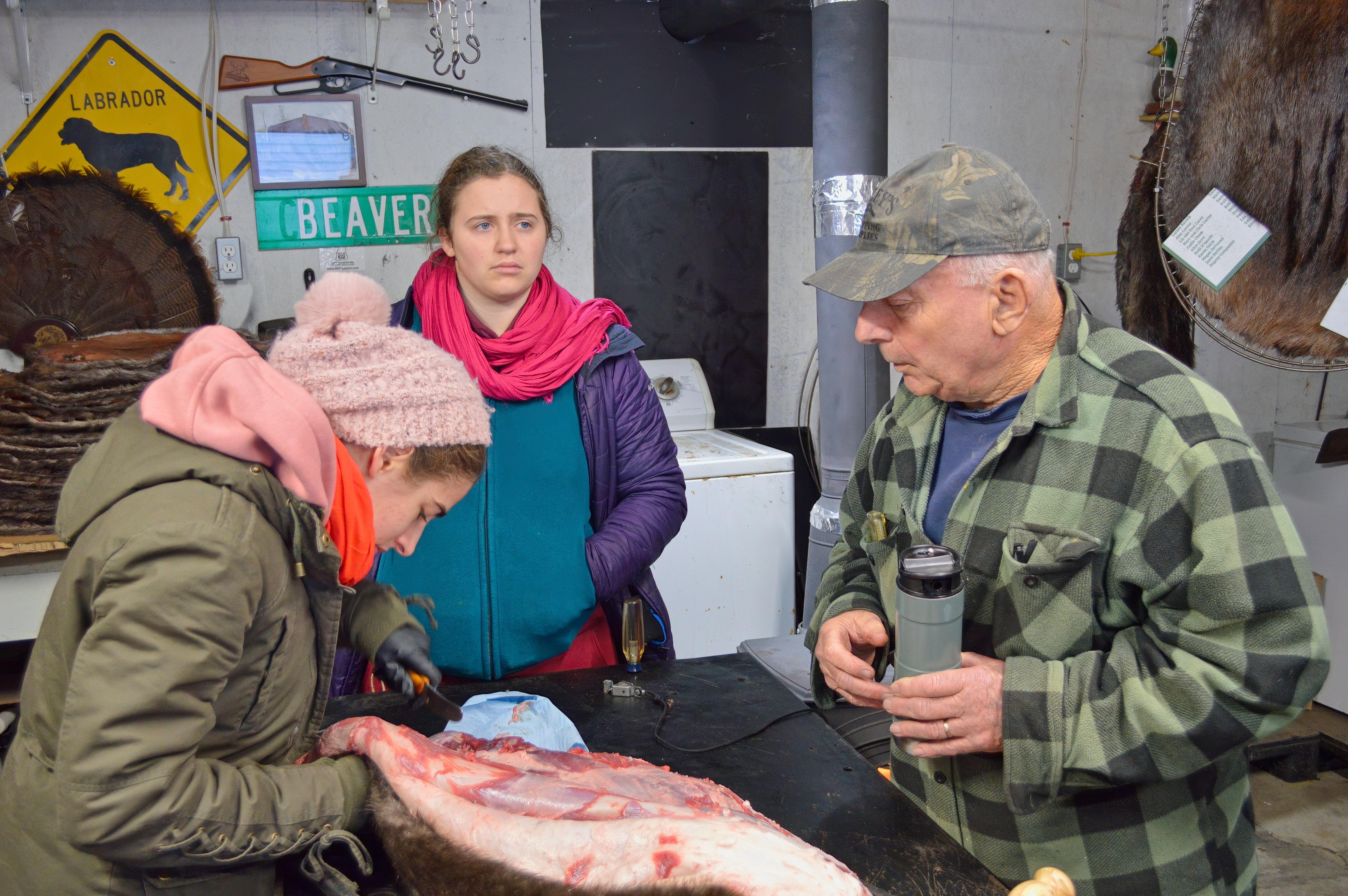 The skinning and fur processing workshop was held today in central New Hampshire and the class was full! Light snow kicked off the day for all attendees but Bob had the wood stove blazing in the fur shed. Several experienced trappers were on hand to assist Bob and we had about 12 folks which made for packed fur shed.